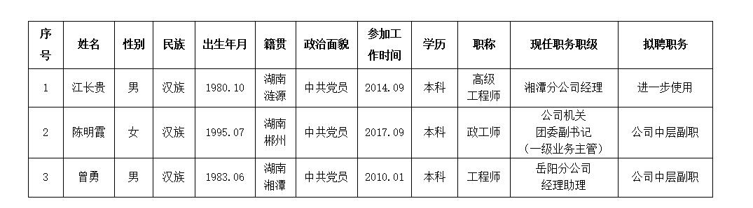 為了加強(qiáng)對干部選拔工作的監(jiān)督,提高識別和任用干部的準(zhǔn)確程度,現(xiàn)對公司黨委會研究決定的江長貴、陳明霞、曾勇3名同志擬聘職務(wù)進(jìn)行任前公示: